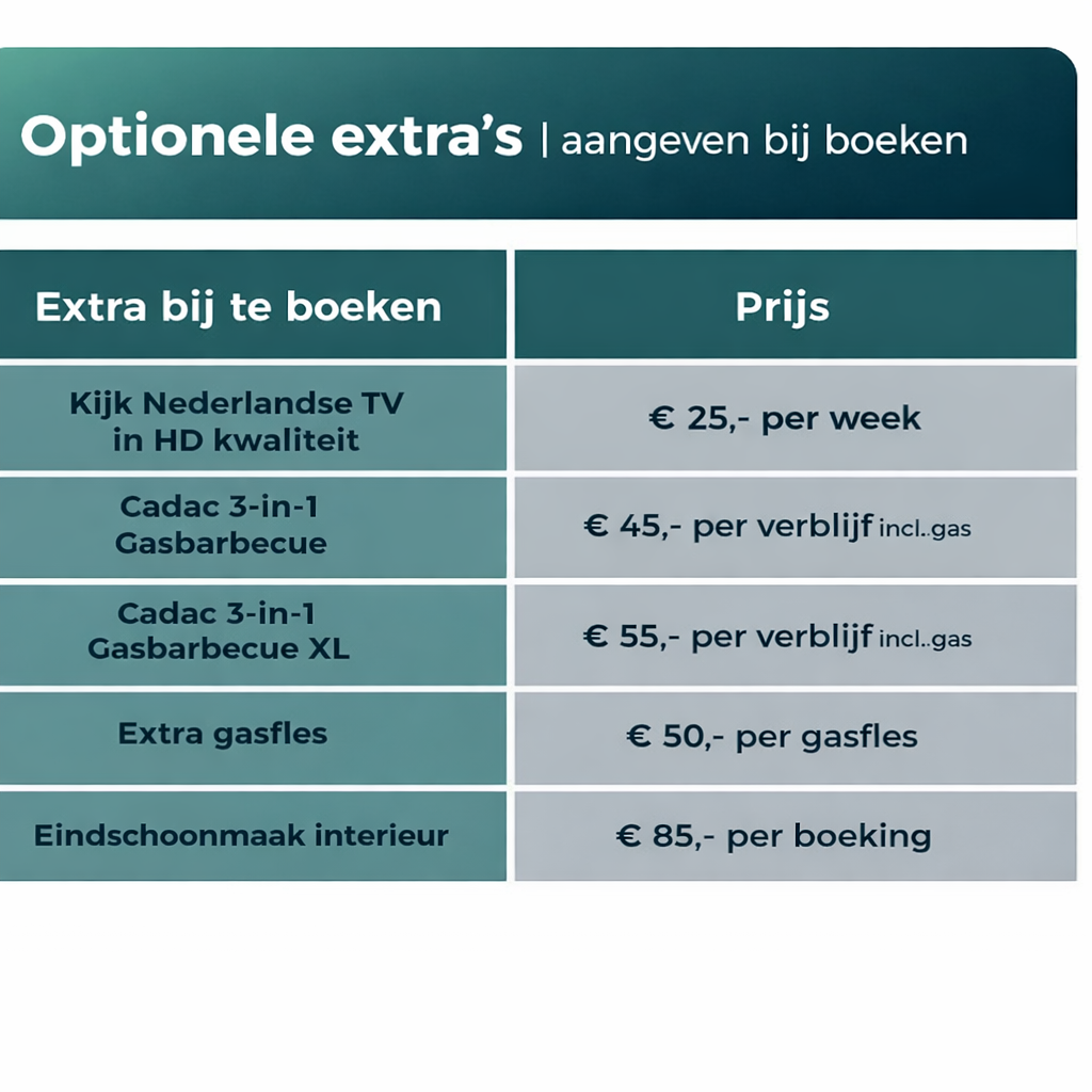 Onze tarieven zijn per week en inclusief complete inventaris, pechhulp en verzekeringen.